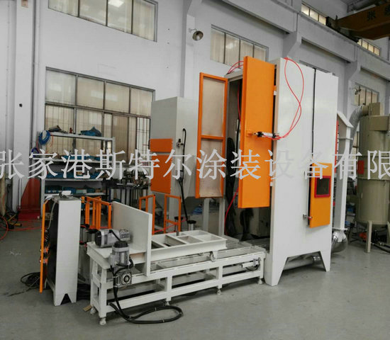 本套設備主要由主機、輸送小車、噴砂系統、回砂系統、除塵系統、裝卸升降平臺、電氣控制系統、空氣壓縮機(用戶自備)等組成。